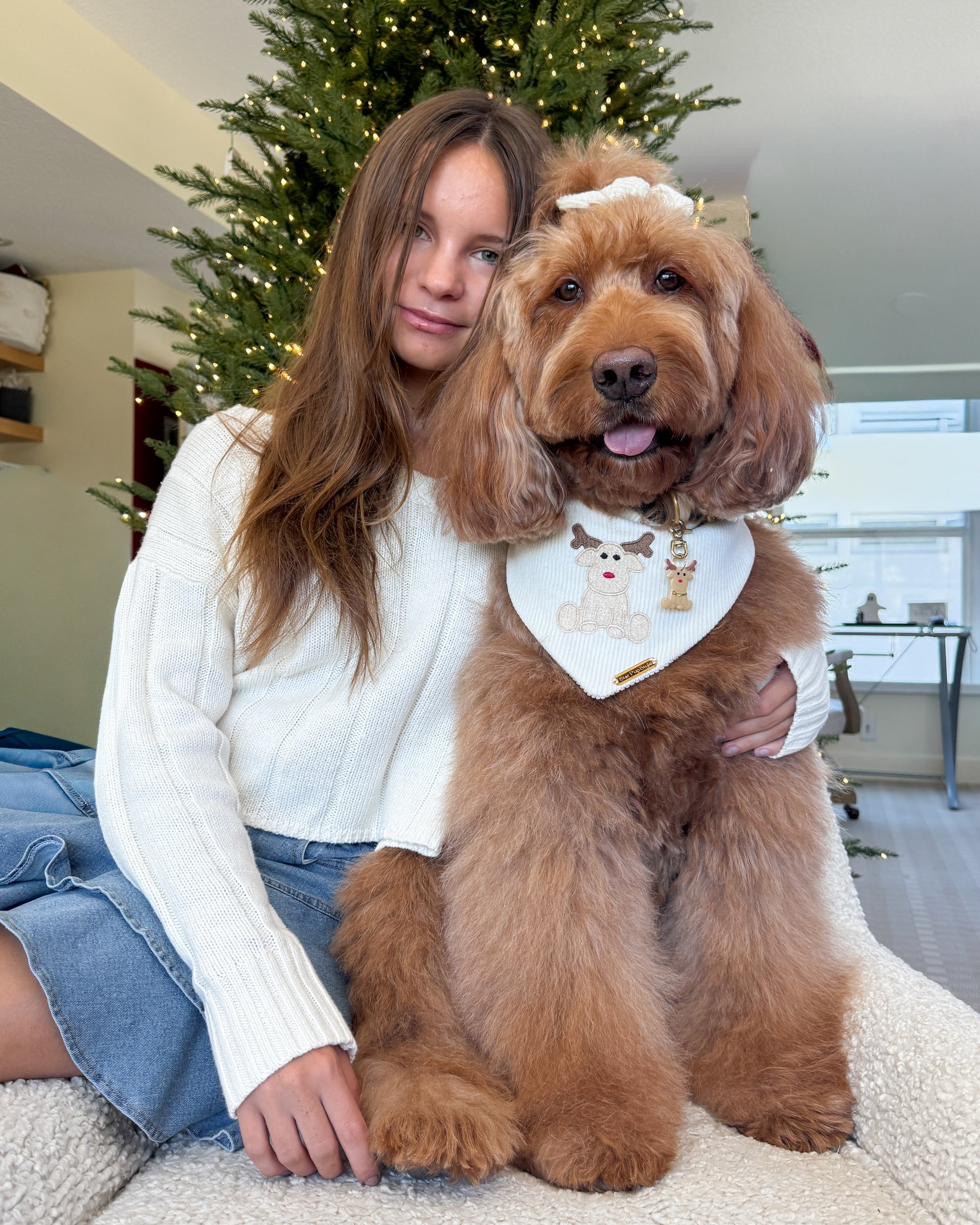 Say hello to Blitzen, the sweetest reindeer of the season, embroidered with care on plush cotton corduroy. His teddy-like shape and adorable expression makes this bandana pure holiday happiness in wearable form.