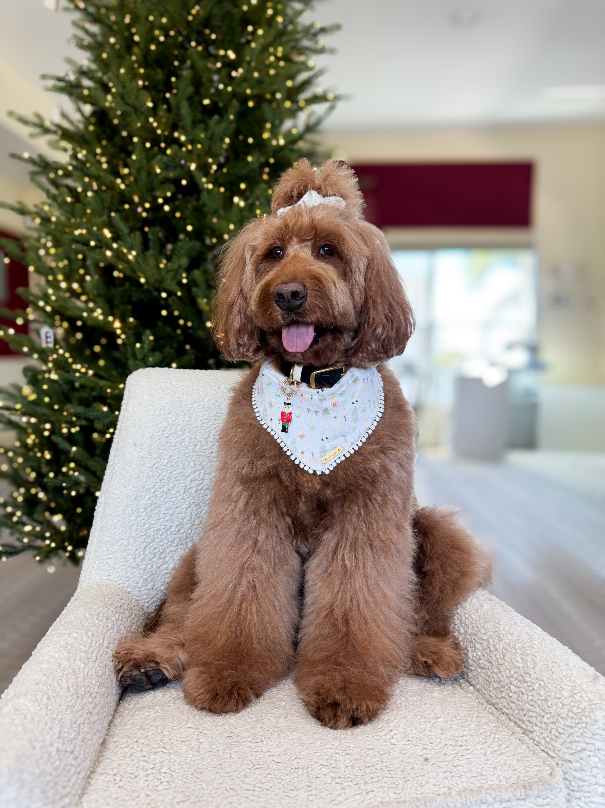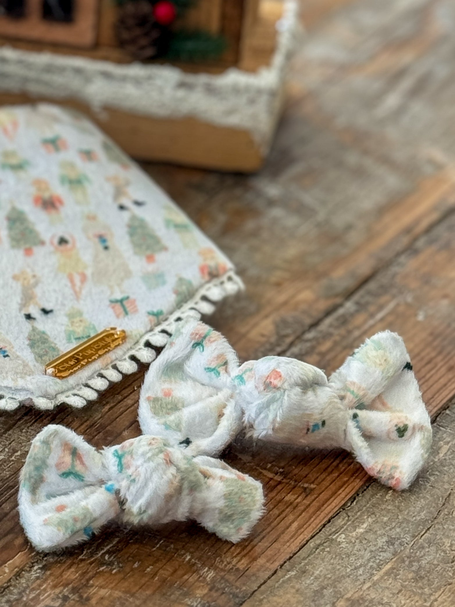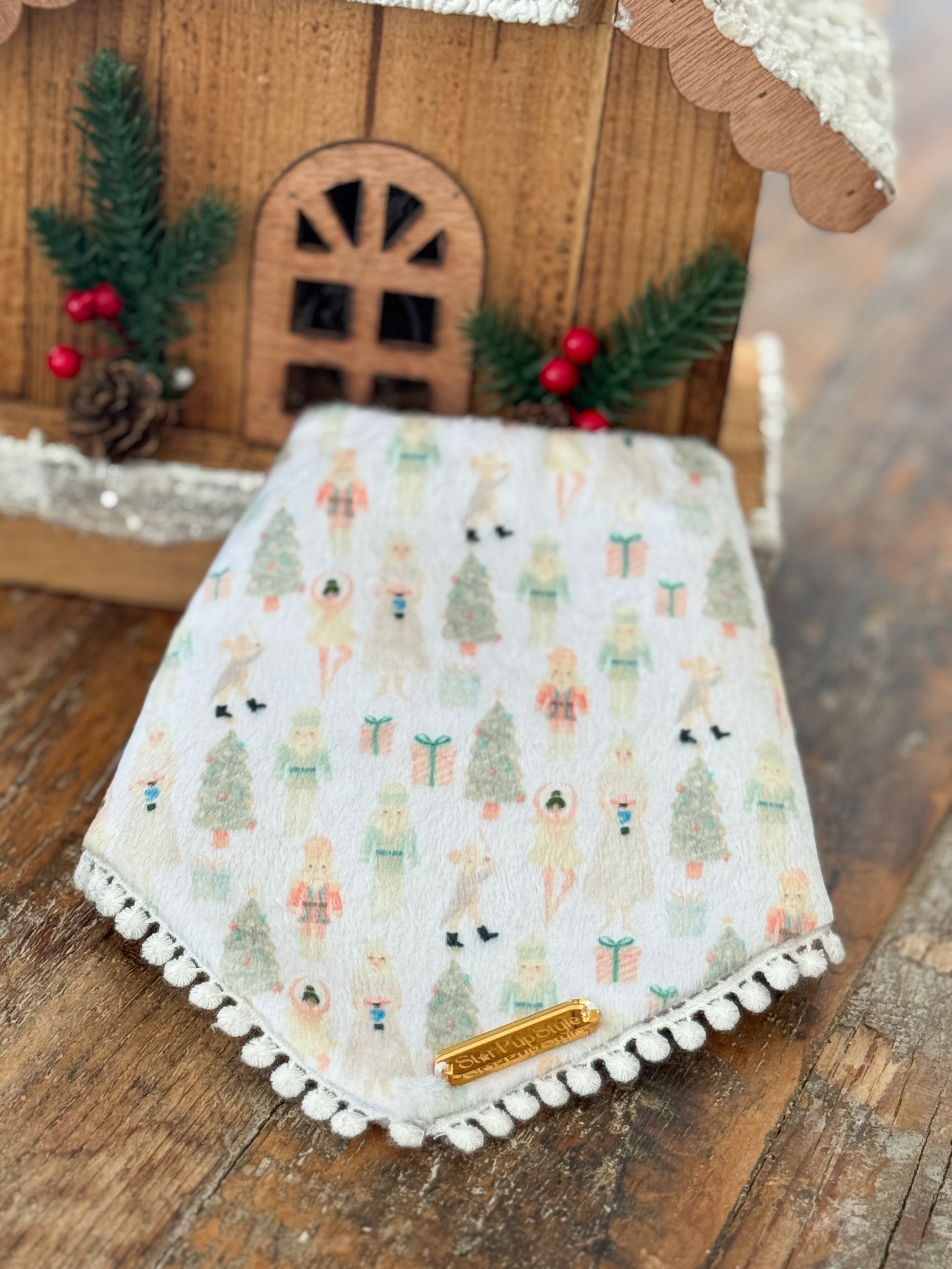 Step into a holiday fairytale with Clara, a bandana made from ultra-soft, plush minky fabric, showcasing a charming Nutcracker scene that brings festive joy. Clara keeps her crisp, elegant shape thanks to a hidden interfacing layer—her little secret for that perfect, tailored look. Perfect for adding a sprinkle of holiday magic and comfort all season long!