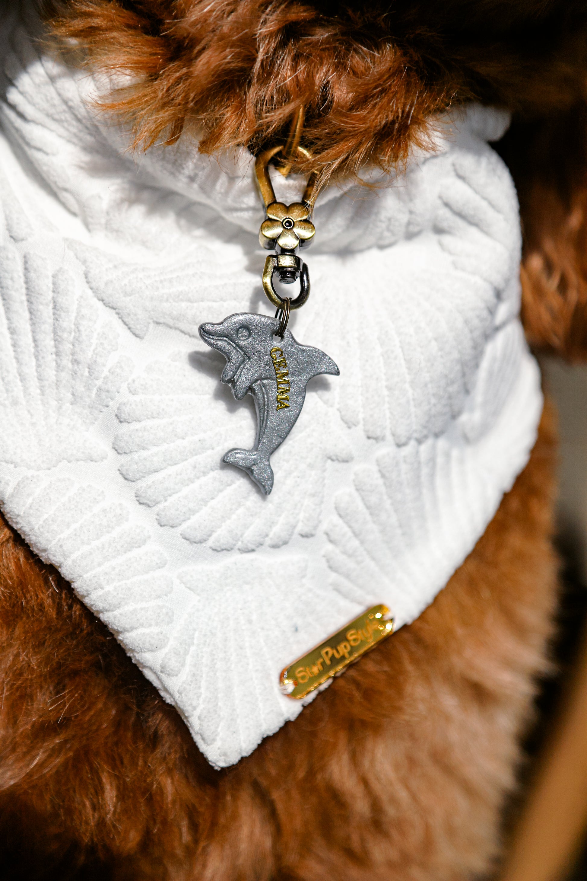 Inspired by ocean waves and playful spirits, the Luna ID tag is delicately shaped like a dolphin. Size: 1.5 inches