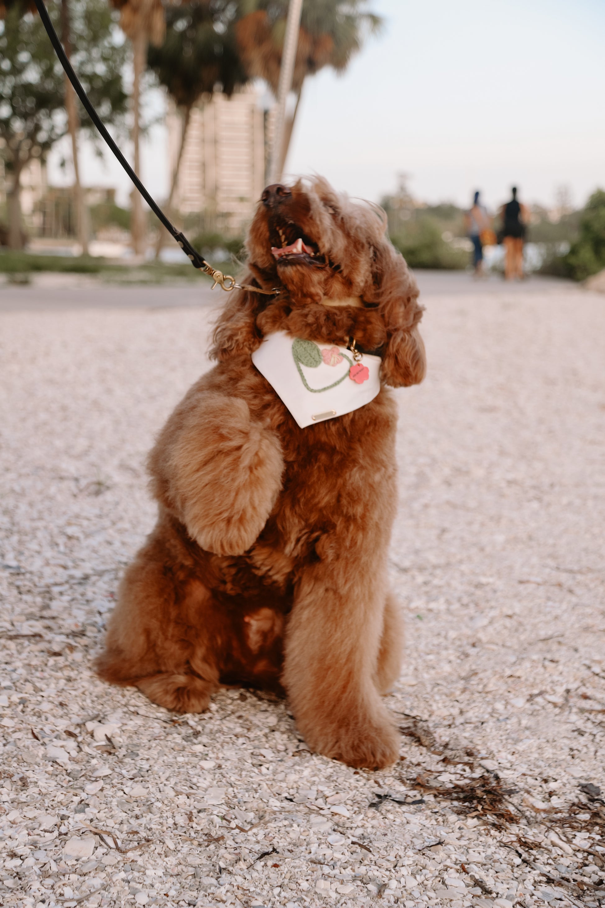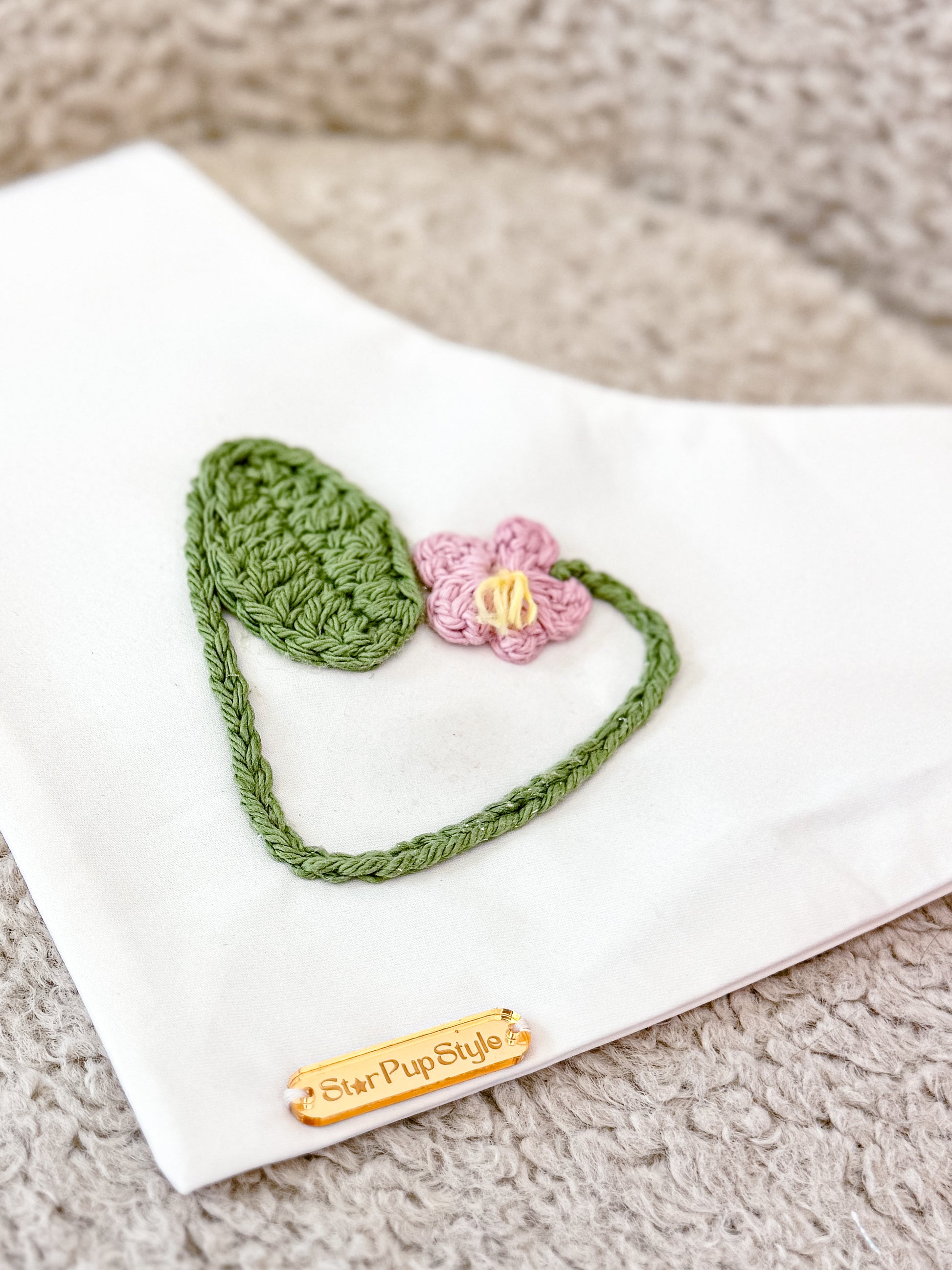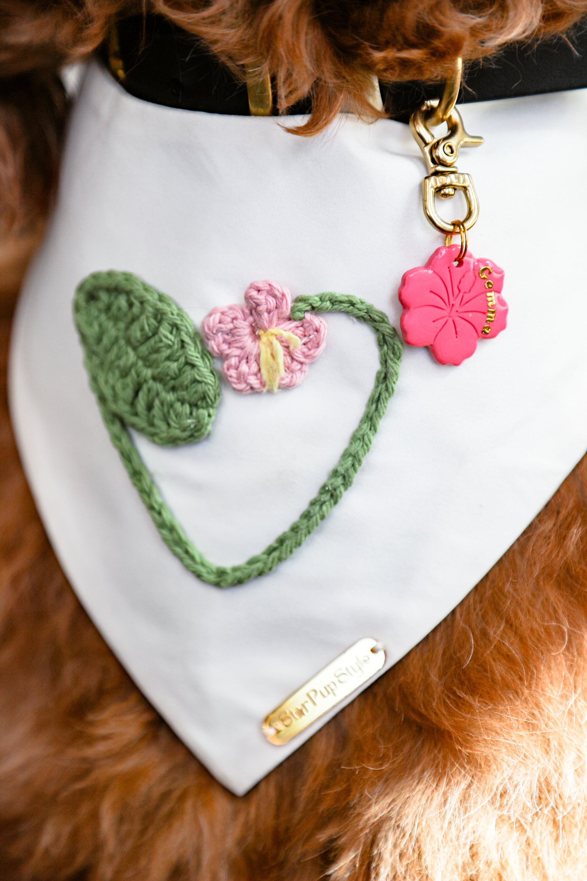 Inspired by my home, Florida, Hibiscus Lane channels the endless summer feeling - tropical blooms, golden light, and breezy days by the coast. This dog bandana is crafted from soft ivory matte satin and topped with a hand-crocheted hibiscus applique made in Hawaii.