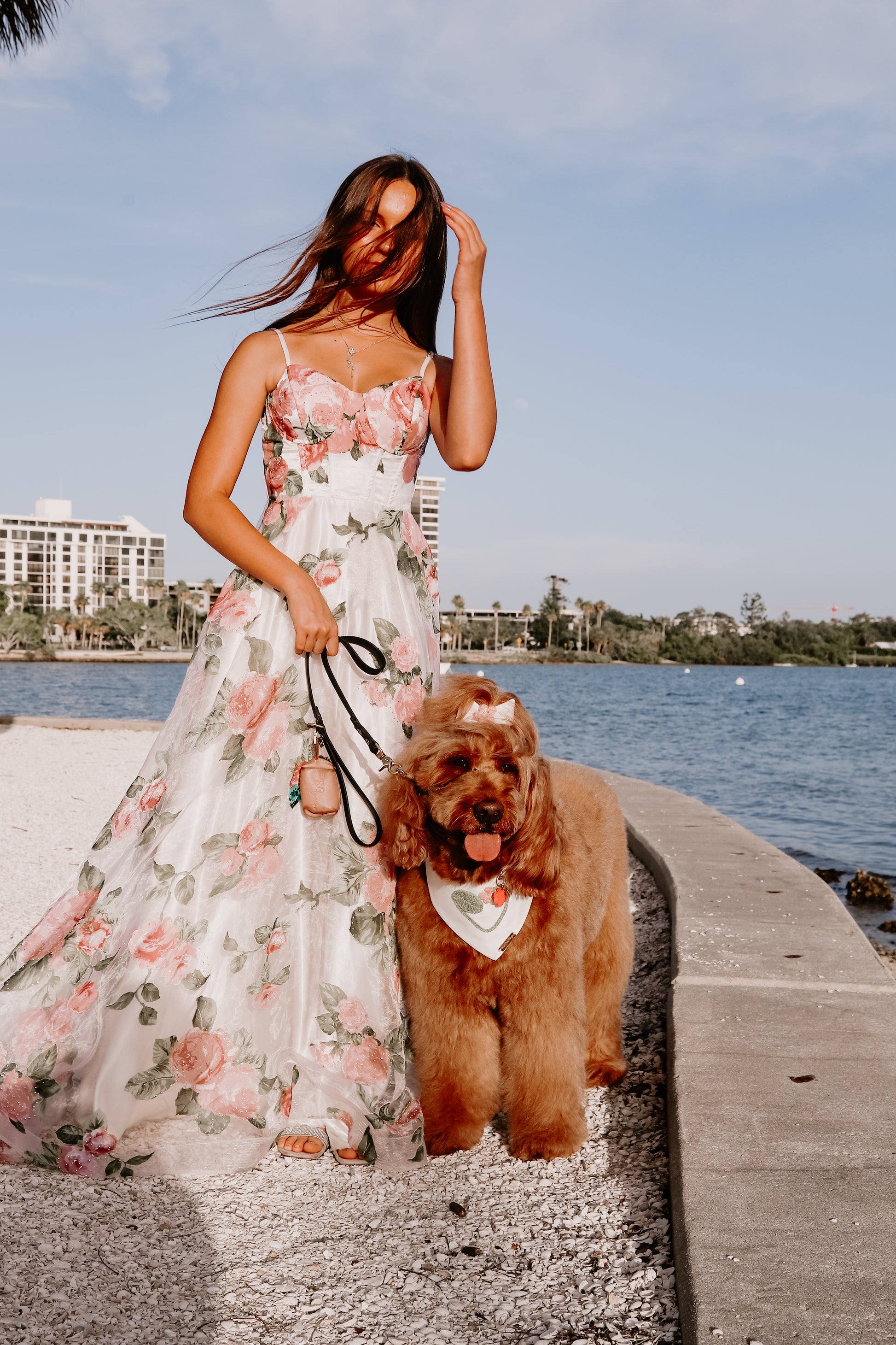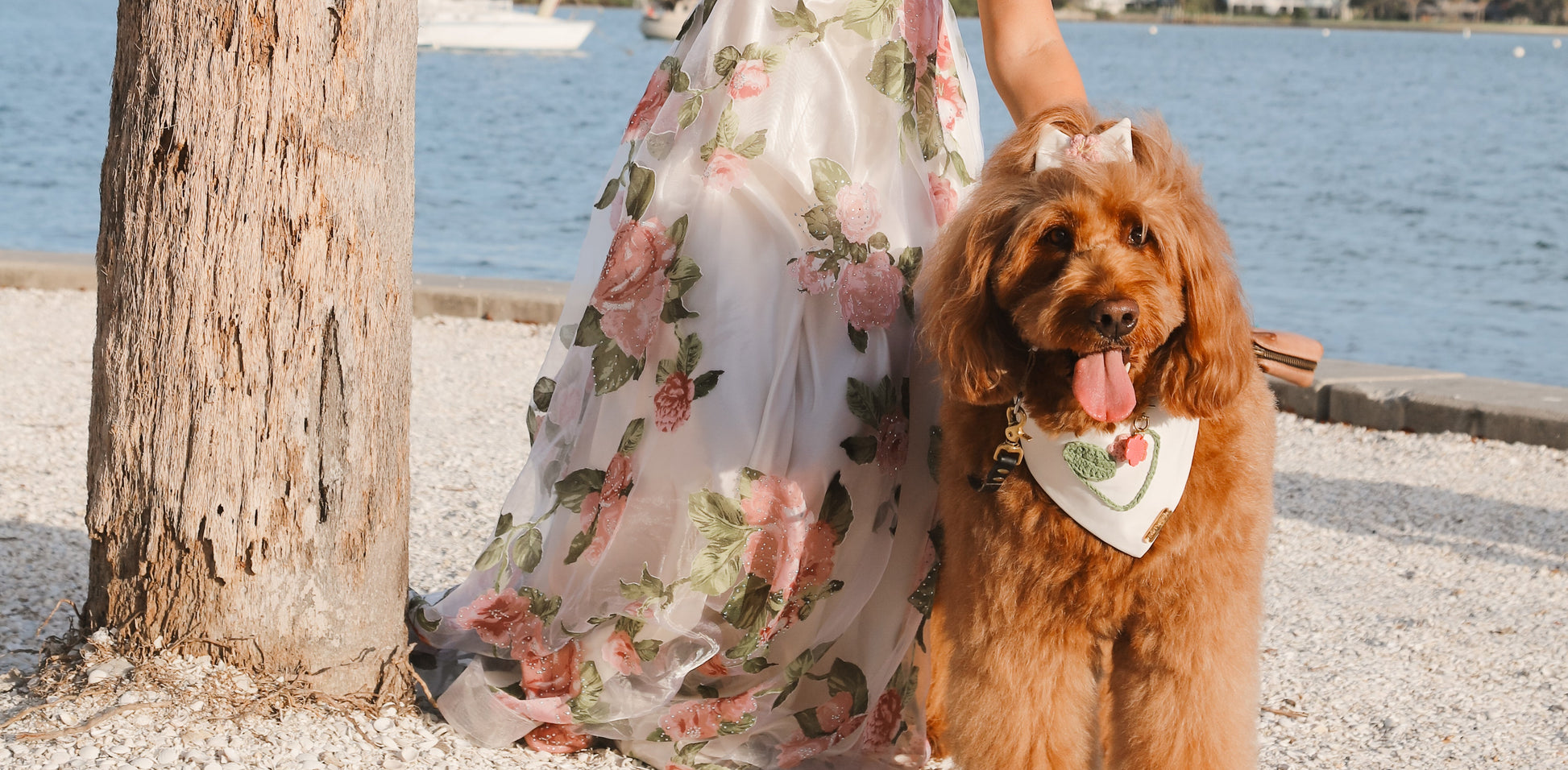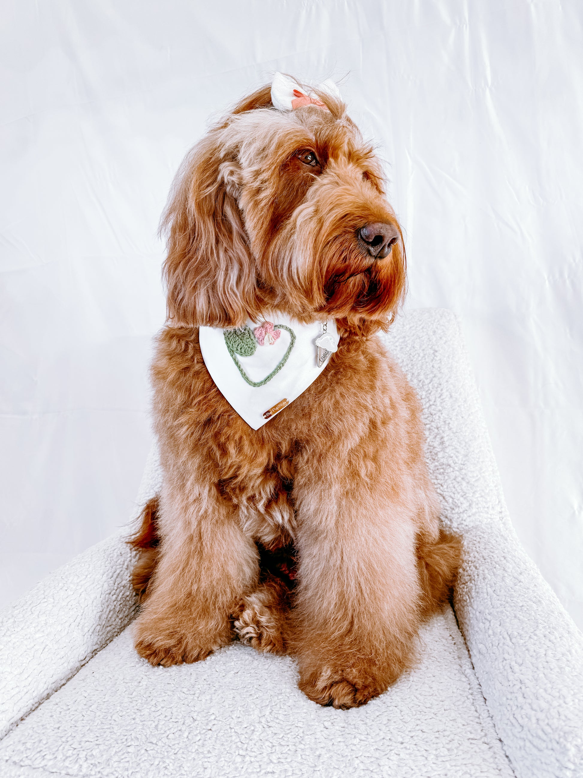 Inspired by my home, Florida, Hibiscus Lane channels the endless summer feeling - tropical blooms, golden light, and breezy days by the coast. This dog bandana is crafted from soft ivory matte satin and topped with a hand-crocheted hibiscus applique made in Hawaii.