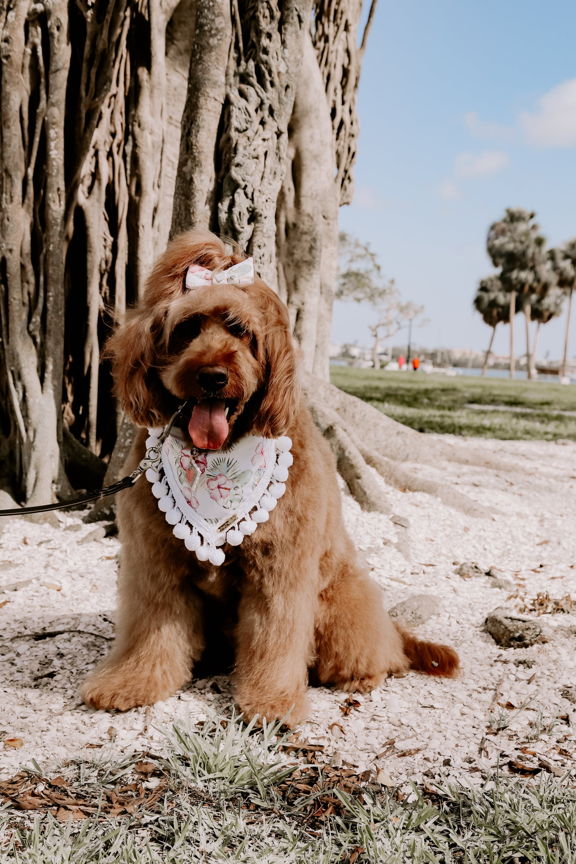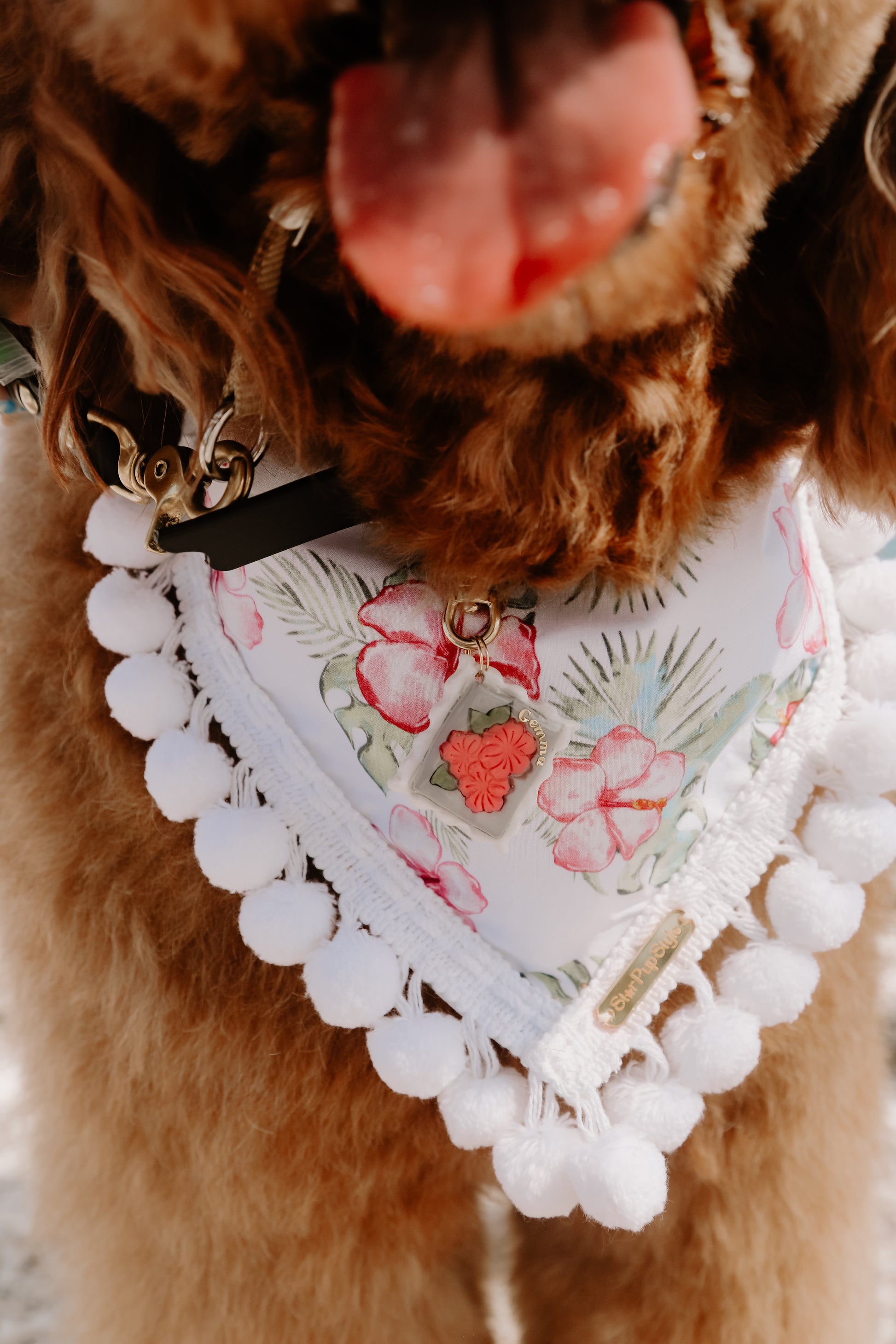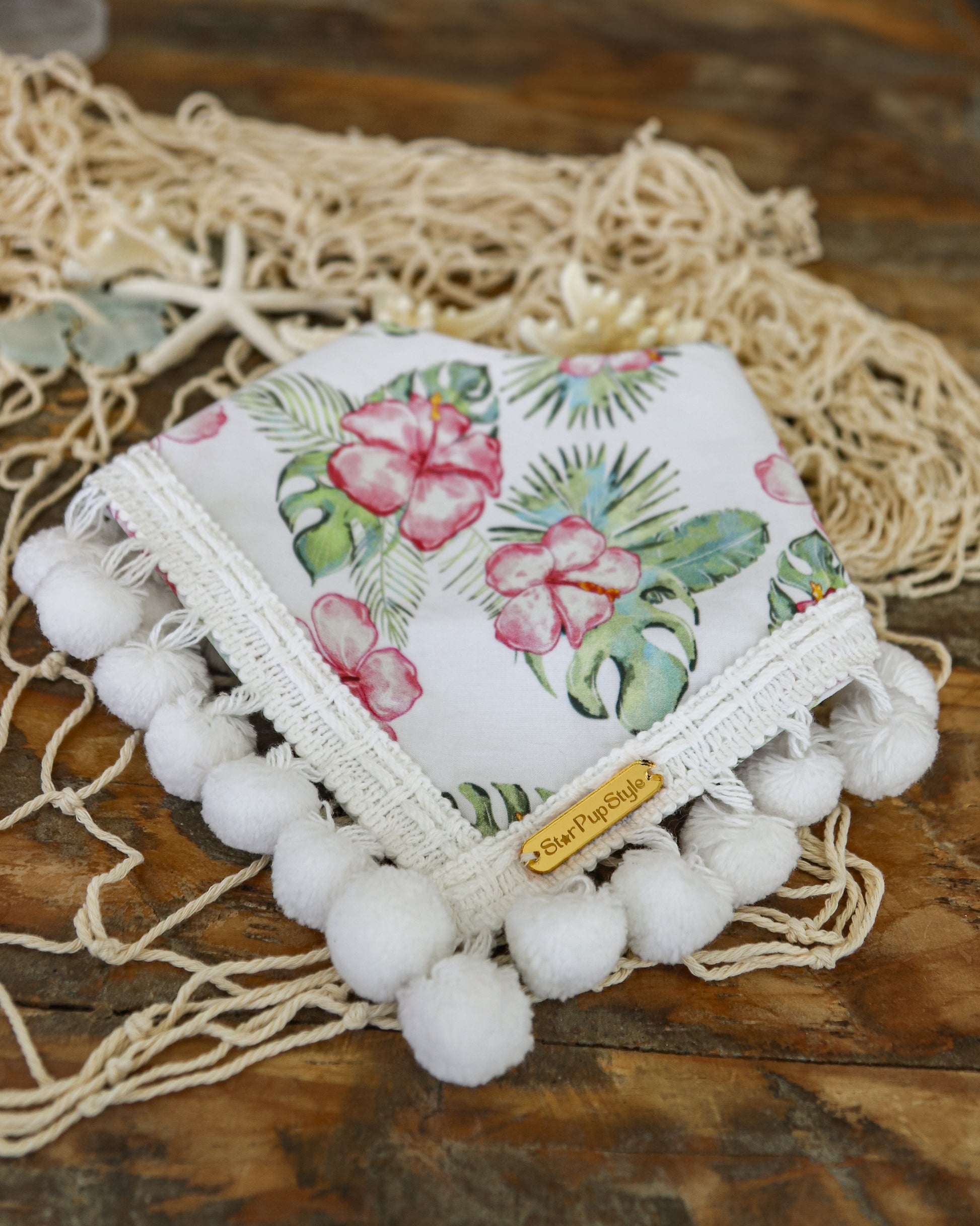 Dive into luxury with our Pink Tide dog bandana, crafted from premium 100% bamboo fabric that's as gentle as it is gorgeous. Adorned with vibrant tropical blooms and optional pom pom trim for that extra flair your pup deserves. Hurry – these head-turning accessories are extremely limited edition, so snag one before the tide goes out! Your fashion-forward furbaby will thank you.