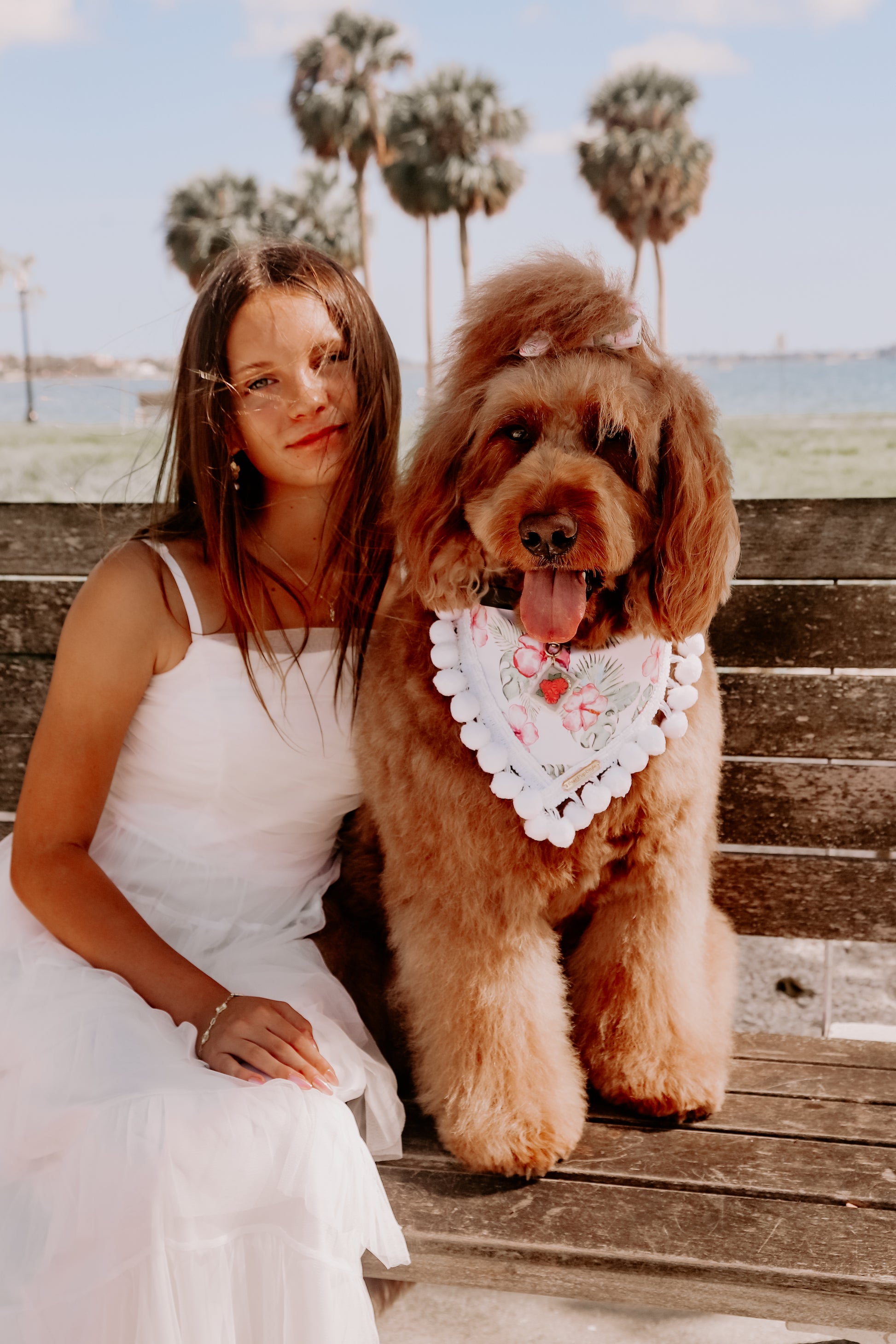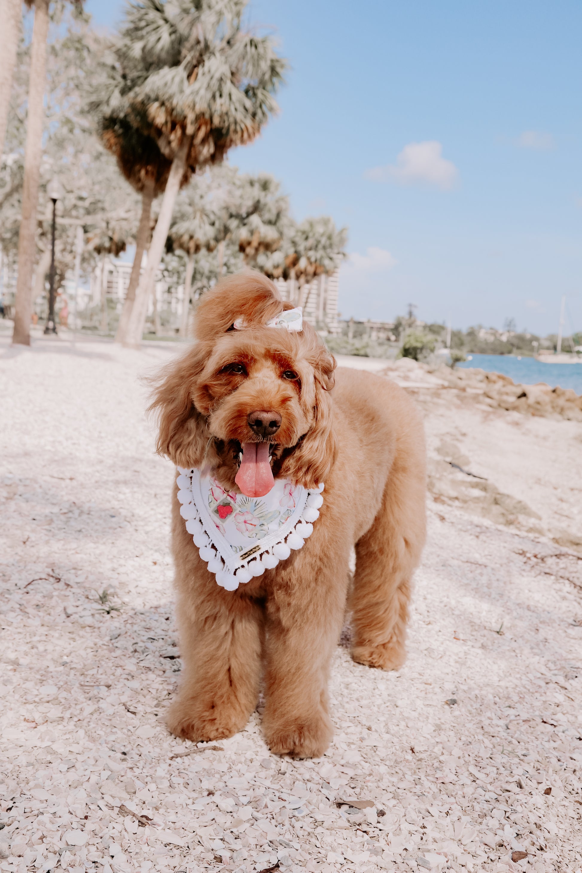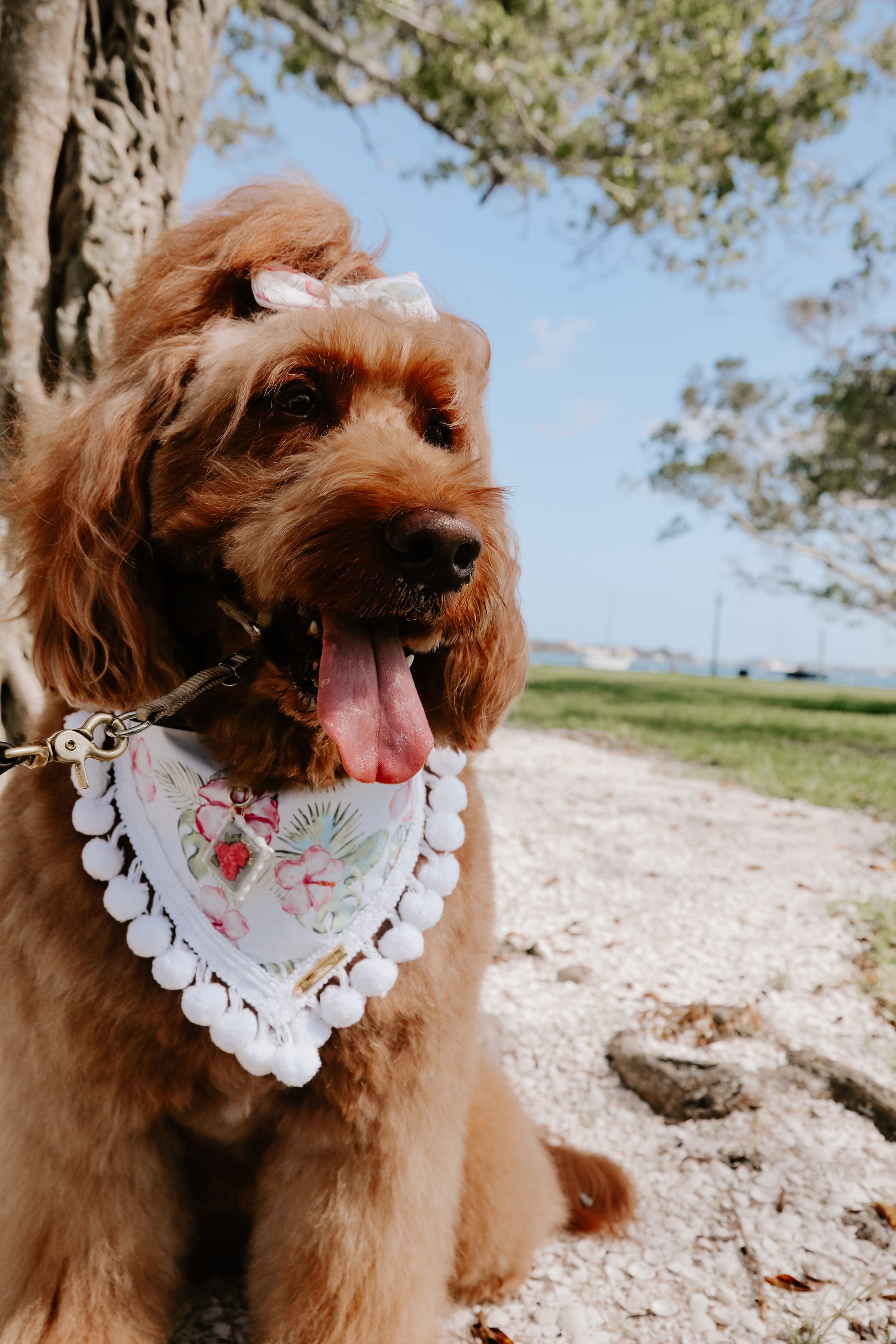 Dive into luxury with our Pink Tide dog bandana, crafted from premium 100% bamboo fabric that's as gentle as it is gorgeous. Adorned with vibrant tropical blooms and optional pom pom trim for that extra flair your pup deserves. Hurry – these head-turning accessories are extremely limited edition, so snag one before the tide goes out! Your fashion-forward furbaby will thank you.
