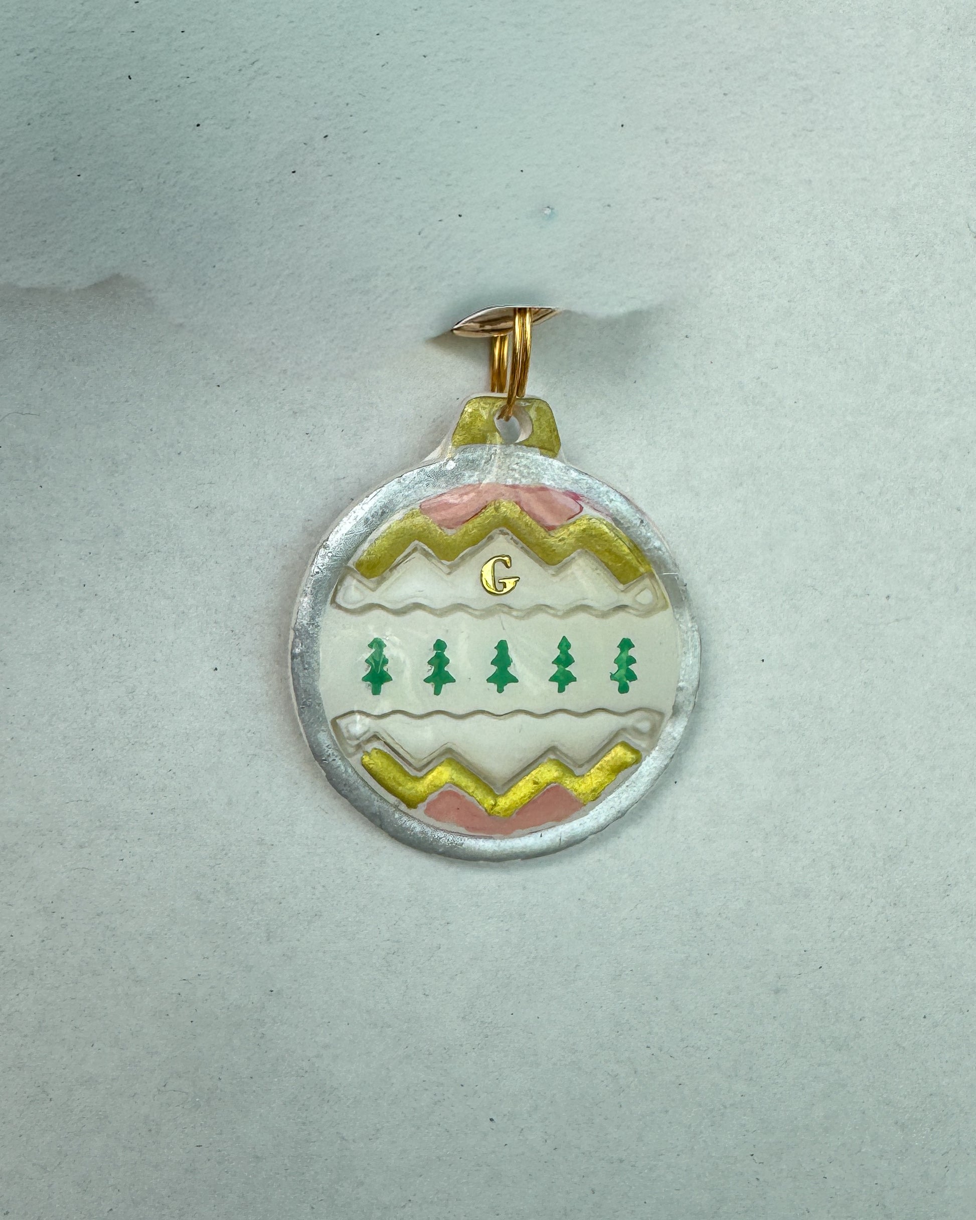 Our Ornament Tag captures the timeless magic of Christmas in a round, bauble inspired design. Handcrafted from polymer clay with whimsical festive details, it’s a nod to the ornaments that make the season sparkle. Each tag is personalized with your pup’s gold initial on the front and their full name on the back in elegant black script. Size: 1.6”