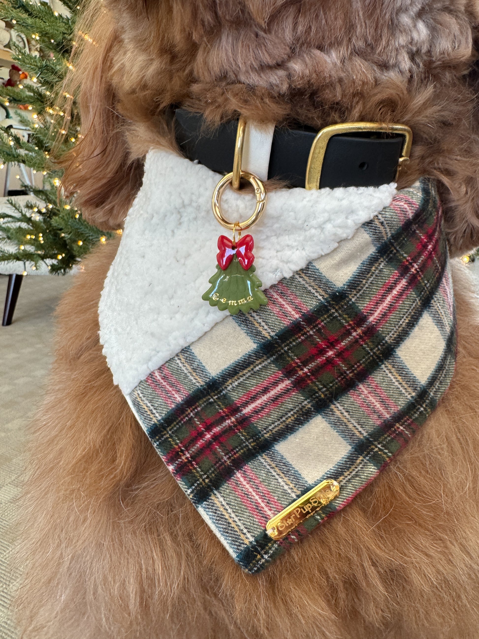 Meet Tree & Bow 🎄, our festive Clay ID pet tag inspired by the elegance of holiday gifting. A classic evergreen tree topped with a red bow and finished in gold – a keepsake piece to complement your pup’s Christmas Edit. Size: 1.25”